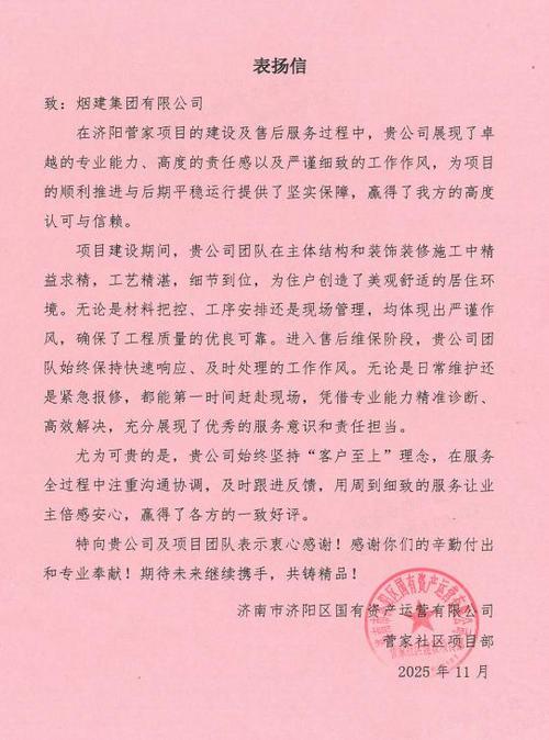 信中指出:“在濟(jì)陽菅家項(xiàng)目的建設(shè)及售后服務(wù)過程中,貴公司展現(xiàn)了卓越的專業(yè)能力、高度的責(zé)任感以及嚴(yán)謹(jǐn)細(xì)致的工作作風(fēng),為項(xiàng)目的順利推進(jìn)與后期平穩(wěn)運(yùn)行提供了堅(jiān)實(shí)保障,贏得了我方的高度認(rèn)可與信賴。項(xiàng)目建設(shè)期間,貴公司團(tuán)隊(duì)在主體結(jié)構(gòu)和裝飾裝修施工中精益求精,工藝精湛,細(xì)節(jié)到位,為住戶創(chuàng)造了美觀舒適的居住環(huán)境。無論是材料把控、工序安排還是現(xiàn)場管理,均體現(xiàn)出嚴(yán)謹(jǐn)作風(fēng),確保了工程質(zhì)量的優(yōu)良可靠。進(jìn)入售后維保階段,貴公司團(tuán)隊(duì)始終保持快速響應(yīng)、及時(shí)處理的工作作風(fēng)。無論是日常維護(hù)還是緊急報(bào)修,都能第一時(shí)間趕赴現(xiàn)場,憑借專業(yè)能力精準(zhǔn)診斷、高效解決,充分展現(xiàn)了優(yōu)秀的服務(wù)意識(shí)和責(zé)任擔(dān)當(dāng)。尤為可貴的是,貴公司始終堅(jiān)持“客戶至上”理念,在服務(wù)全過程中注重溝通協(xié)調(diào),及時(shí)跟進(jìn)反饋,用周到細(xì)致的服務(wù)讓業(yè)主倍感安心,贏得了各方的一致好評(píng)。特向貴公司及項(xiàng)目團(tuán)隊(duì)表示衷心感謝!感謝你們的辛勤付出和專業(yè)奉獻(xiàn)!期待未來繼續(xù)攜手,共鑄精品!”